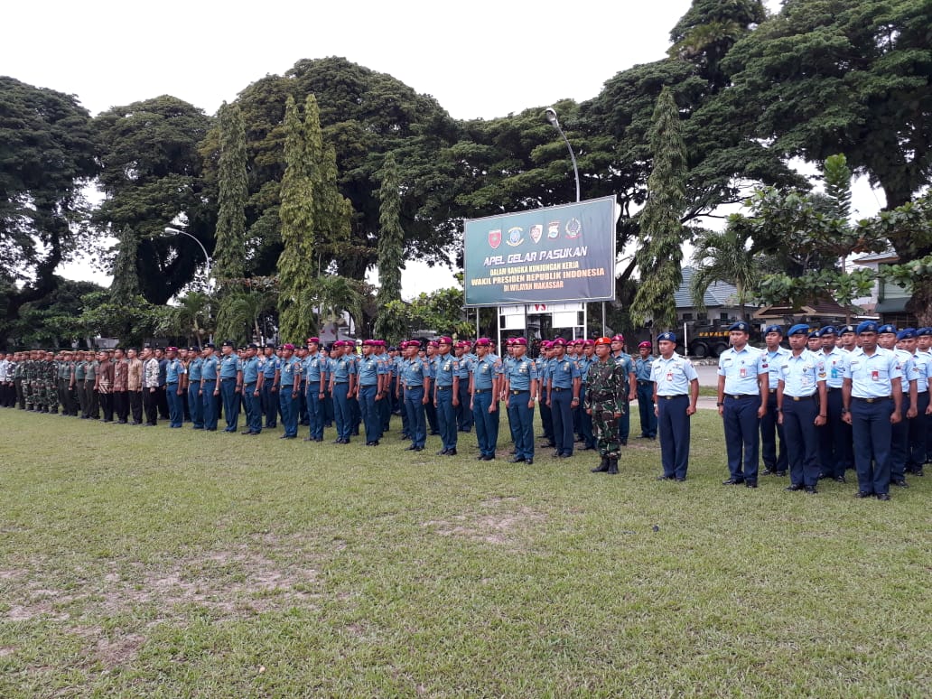 Apel gabungan yang digelar di lapangan Hasanuddin tersebut guna mempersiapkan pengamanan kedatangan Wapres RI pada hari Sabtu tanggal 23 Februari hingga hari Senin tanggal 25 Februari 2019.