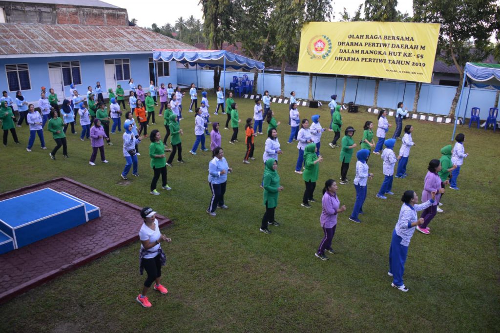 Dalam sambutan Ketua Pia Ardhya garini Cab. 9 Ny. Griswanti Widyanti Insan Nanjaya mengucapkan selamat datang kepada Unsur Pimpinan maupun anggota Dharma Pertiwi Daerah M guna melaksanakan olahraga bersama di Lanud Sam Ratulangi. Kegiatan dilanjutkan dengan Sambutan Ketua Dharma Pertiwi Daerah M Ny. Linda Tiopan Aritonang bahwa kegiatan ini dalam rangka memperingati HUT ke-55 Dharma Pertiwi. Selain itu, diharapkan Anggota Dharma Pertiwi untuk mengurangi sampah plastik demi menjaga kesehatan kita. Sebelumnya telah dilaksanakan kegiatan Anjangsana, Acara Gemar Menabung, Gemar makan Ikan dan menanam Pohon/Sayuran untuk anak anak.