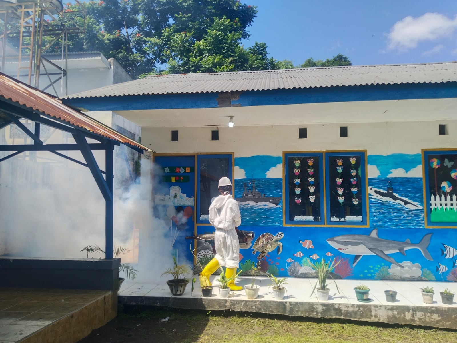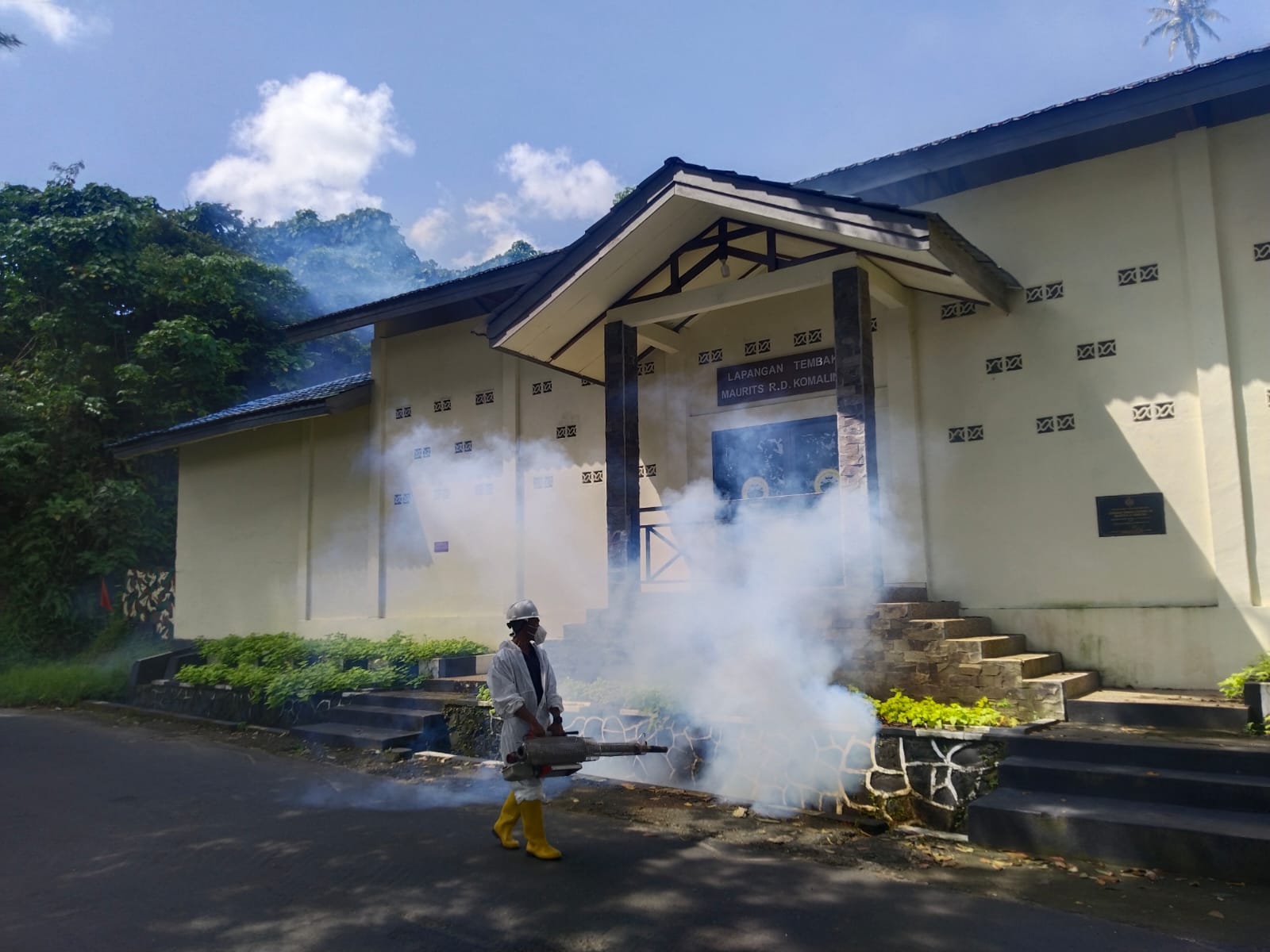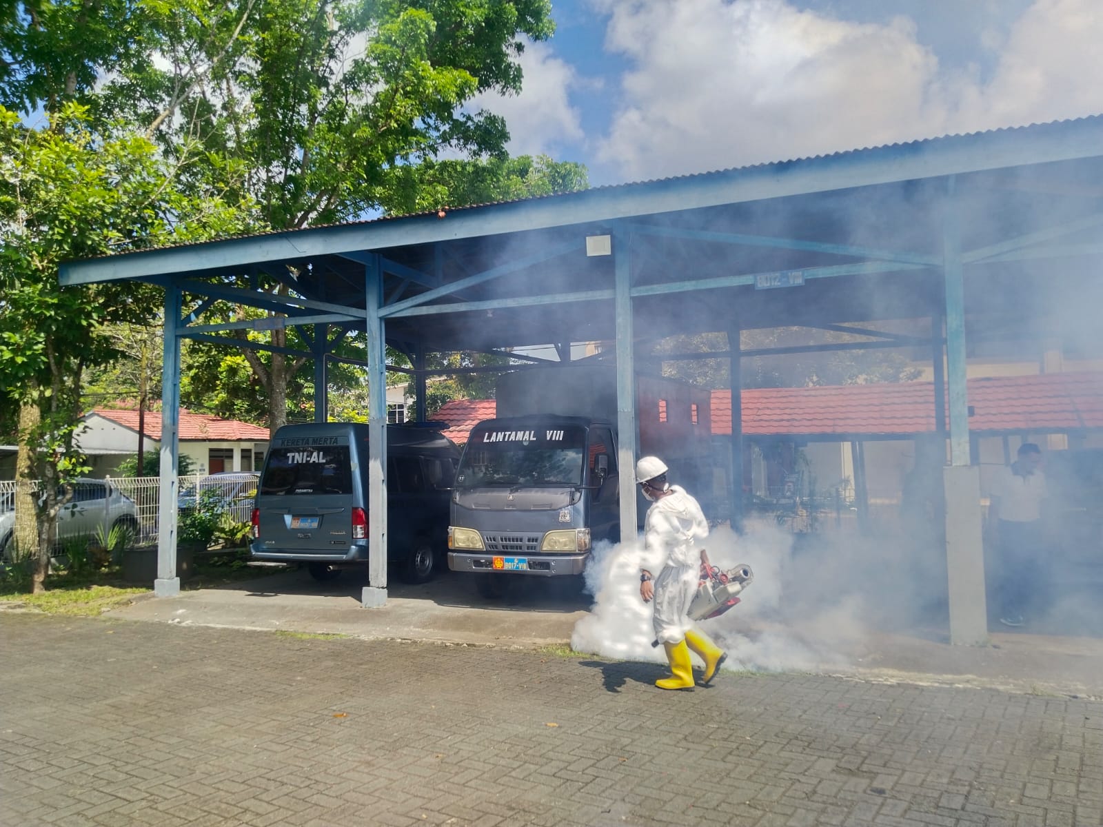 Manado 11 April 2025, Danlantamal VIII Laksamana Pertama TNI May Franky Pasuna Sihombing, CHRMP., memerintahkan Kadiskes Lantamal VIII melaksanakan kegiatan fogging atau pengasapan nyamuk untuk cegah penyakit Demam Berdarah Dengue (DBD) di lingkungan sekitar Markas Komando Lantamal VIII Manado. Jumat (11/4)