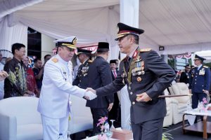 Makassar – Komandan Lantamal VI (Danlantamal VI) Brigjen TNI (Mar) Dr. Wahyudi, S.E., M.Tr.Hanla., M.M., M.Han didampingi Ketua Korcab VI DJA II Ny. Afrina Amalia Wahyudi bersama para pejabat Forkopimda Sulawesi Selatan menghadiri upacara peringatan Hari Bhayangkara ke-79 Tahun 2025, bertempat di lapangan Apel Polda Sulsel, Selasa (01/07/2025).