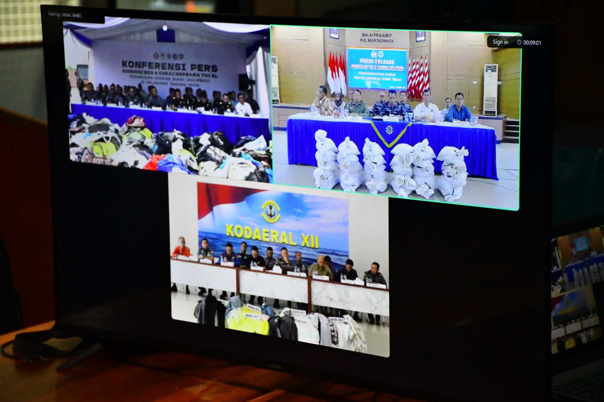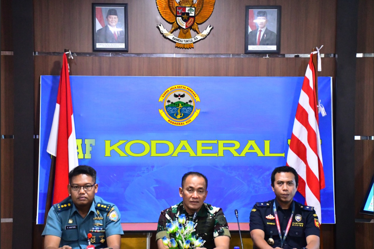 Manado 14 Agustus 2025, Komandan Kodaeral VIII Laksda TNI Dery Triesananto Suhendi, S.E., M.Tr.Opsla., diwakili Asops Dankodaeral VIII mengikuti konferensi pers keberhasilan tim gabungan TNI Angkatan Laut dan Bea Cukai dalam mengamankan tiga kontainer bermuatan ballpress secara vicon bertempat di Ruang Rapat OYU Mako Kodaeral VIII. Kamis (14/8)