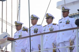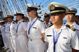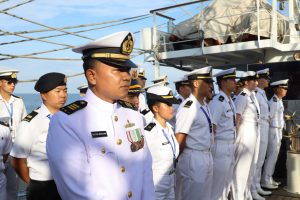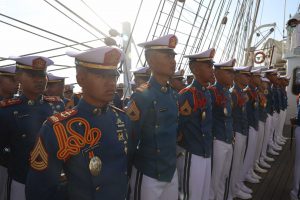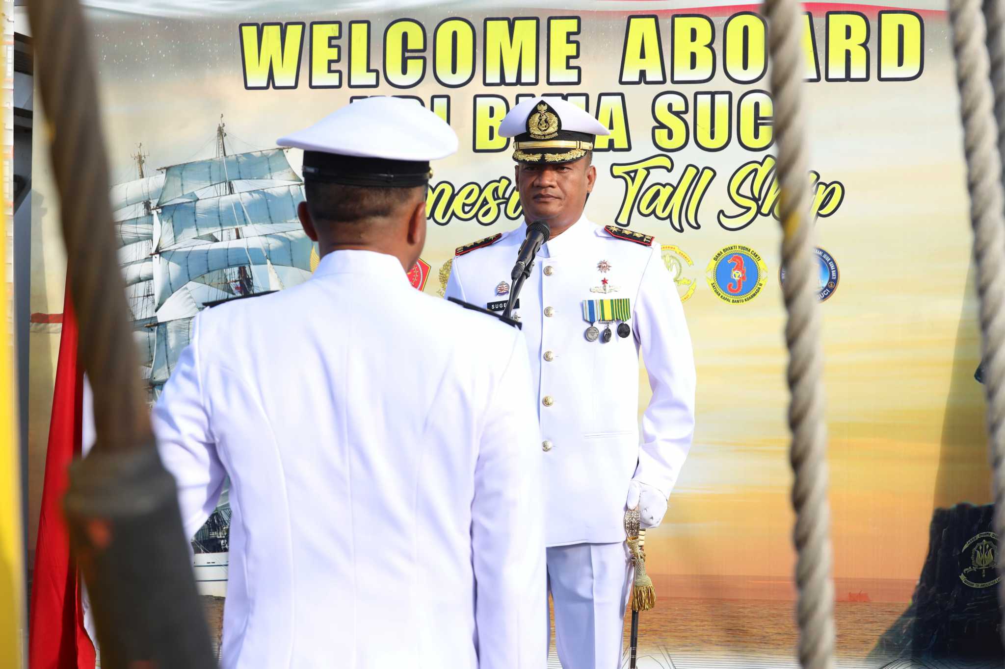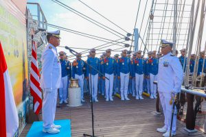Penuh semangat Prajurit KRI Bima suci beserta Taruna/Kadet Akademi TNI AL (AAL) Angkatan ke-72 korps Pelaut, dan para peserta ASEAN Plus Cadet Sail (APCS) 2025 berbaris dengan rapi dan teratur memenuhi geladak tengah kapal. Bertindak sebagai Komandan Upacara (Danup) Mayor Laut (P) Orri Kaufmann.