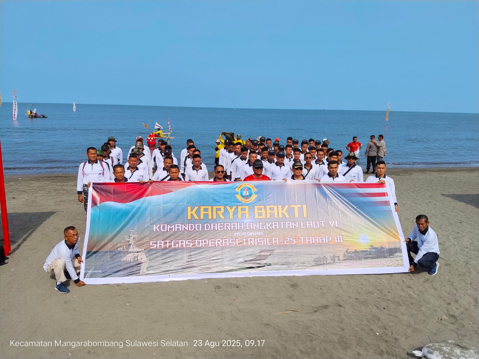 Takalar, TNI Angkatan Laut kembali menunjukkan eksistensinya sebagai penjaga samudra dan sahabat rakyat. Dalam semangat pengabdian tiada henti, Kodaeral VI bekerja sama dengan Satgas Operasi Trisila Ke-25 Tahap III Tahun 2025 menggelar Karya Bakti monumental di Pantai Topejawa, Desa Topejawa, Kecamatan Mangarabombang, Kabupaten Takalar, Sabtu (23/08/2025).