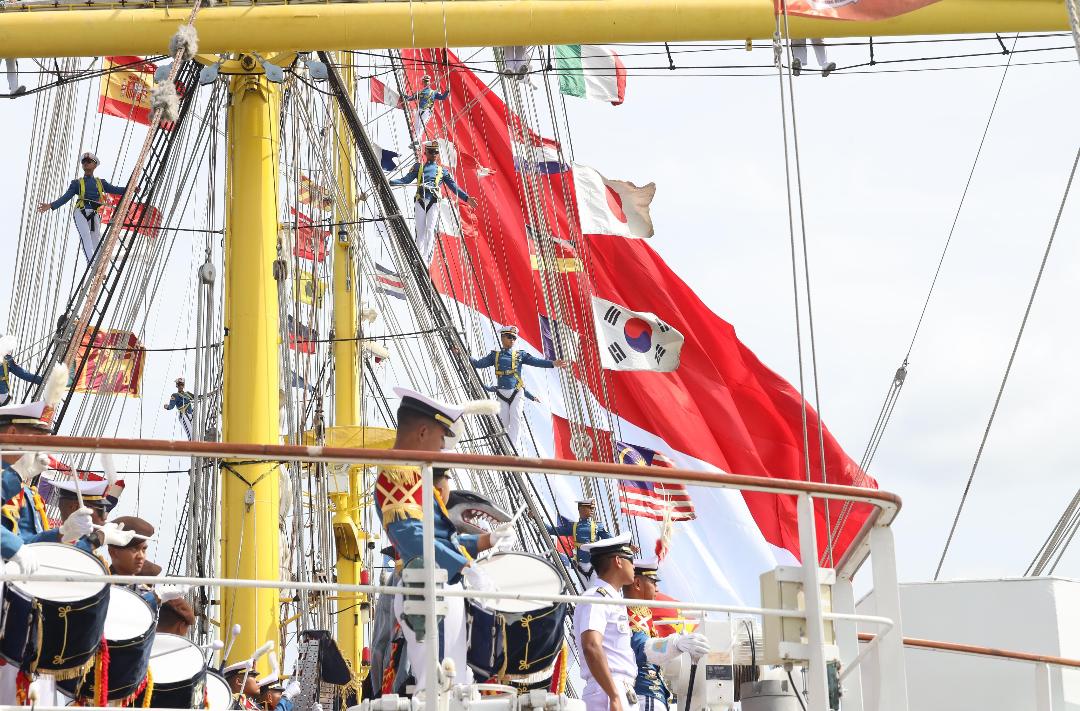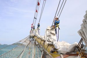 KRI Bima Suci, kapal layar tiang tinggi kebanggaan TNI Angkatan Laut, bertolak dari Sattahip, Thailand setelah sukses melaksanakan misi diplomasi duta bangsa sekaligus Latihan Kartika Jala Krida (KJK) Taruna Akademi Angkatan Laut Tingkat III Korps Pelaut Angkatan ke-72 TA 2025, Sabtu (30/8). Pelayaran muhibah diplomasi ini menjadi sarana memperkenalkan budaya bangsa sekaligus memperkuat hubungan persahabatan dengan negara sahabat.