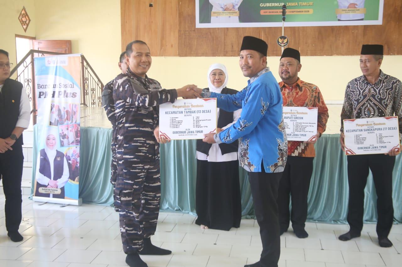 Panglima Koarmada II Laksda TNI I G.P. Alit Jaya, S.H., M. Si, mendampingi Gubernur Jawa Timur Khofifah Indar Parawansa, memberikan bantuan sosial kepada masyarakat di Pulau Bawean, Kabupaten Gresik, Sabtu (6/9/2025).