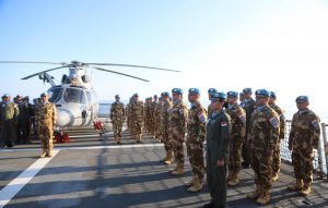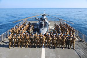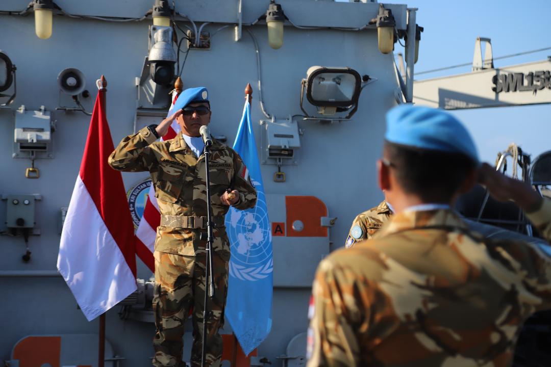 Dalam rangka memperingati Hari Ulang Tahun (HUT) ke-80 TNI Angkatan Laut, prajurit Satgas MTF TNI Konga XXVIII-P/UNIFIL melaksanakan upacara di geladak heli KRI Sultan Iskandar Muda-367 (KRI SIM-367) yang tengah melaksanakan patroli rutin di Perairan Mediterania, Lebanon, Rabu (10/9). Komandan KRI SIM-367 selaku Dansatgas MTF TNI Konga XXVIII-P/UNIFIL, Letkol Laut (P) Anugerah Annarullah bertindak sebagai Inspektur Upacara (Irup), sementara Kadiv PAA Kapten Laut (P) Yoga Setiawan bertindak sebagai Komandan Upacara (Danup). Upacara berlangsung khidmat dengan diikuti seluruh prajurit Satgas.