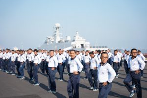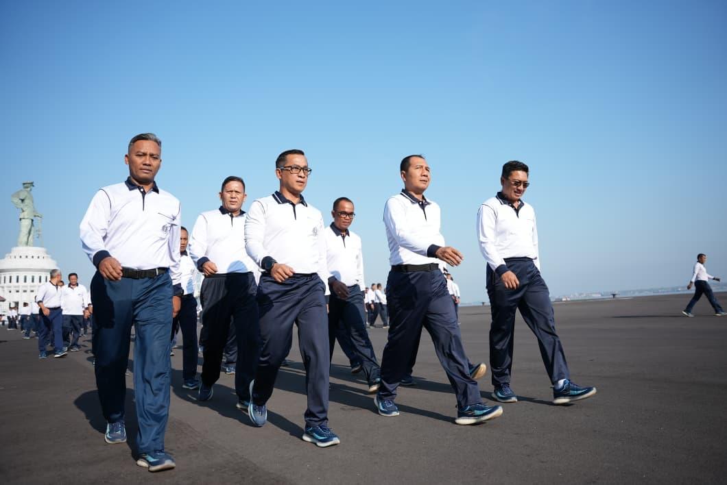 Pangkoarmada II Laksda TNI I G. P. Alit Jaya, S.H., M.Si., melaksanakan olahraga bersama prajurit dan pejabat Koarmada II di Dermaga Madura, Ujung Surabaya, Selasa (23/9). Kegiatan ini adalah upaya menjaga kesehatan agar mampu menjalankan tugas secara profesional.