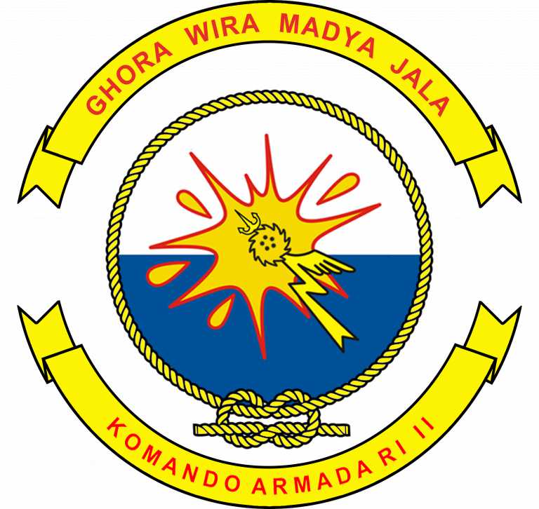 Arti moto Ghora Wira Madya Jala seperti yang tertera pada logo Koarmada II adalah: Ghora berarti sesuatu yang besar dan memiliki kewibawaan; Vira berarti prajurit yang mempunyai sifat keberanian; Madya berarti di tengah. Jala berarti di laut. Sehingga secara keseluruhan makna dari moto ini adalah “Ksatria Perkasa di Tengah Samudera. Sedangkan untuk gambar di tengah-tengah logo adalah penyatuan 3 (tiga) unsur kemampuan pokok (peperangan atas air, peperangan bawah air, dan udara) yang dilengkapi dengan senjata ampuh “Cakra” berbentuk kilat bersayap, yang melukiskan Koarmada II sanggup bergerak dengan cepat dan mampu menghancurkan lawan dengan tepat dan sempurna. Ledakan kuning dengan pinggiran merah dimaksudkan sebagai angkara murka yang harus dibasmi dari muka bumi.